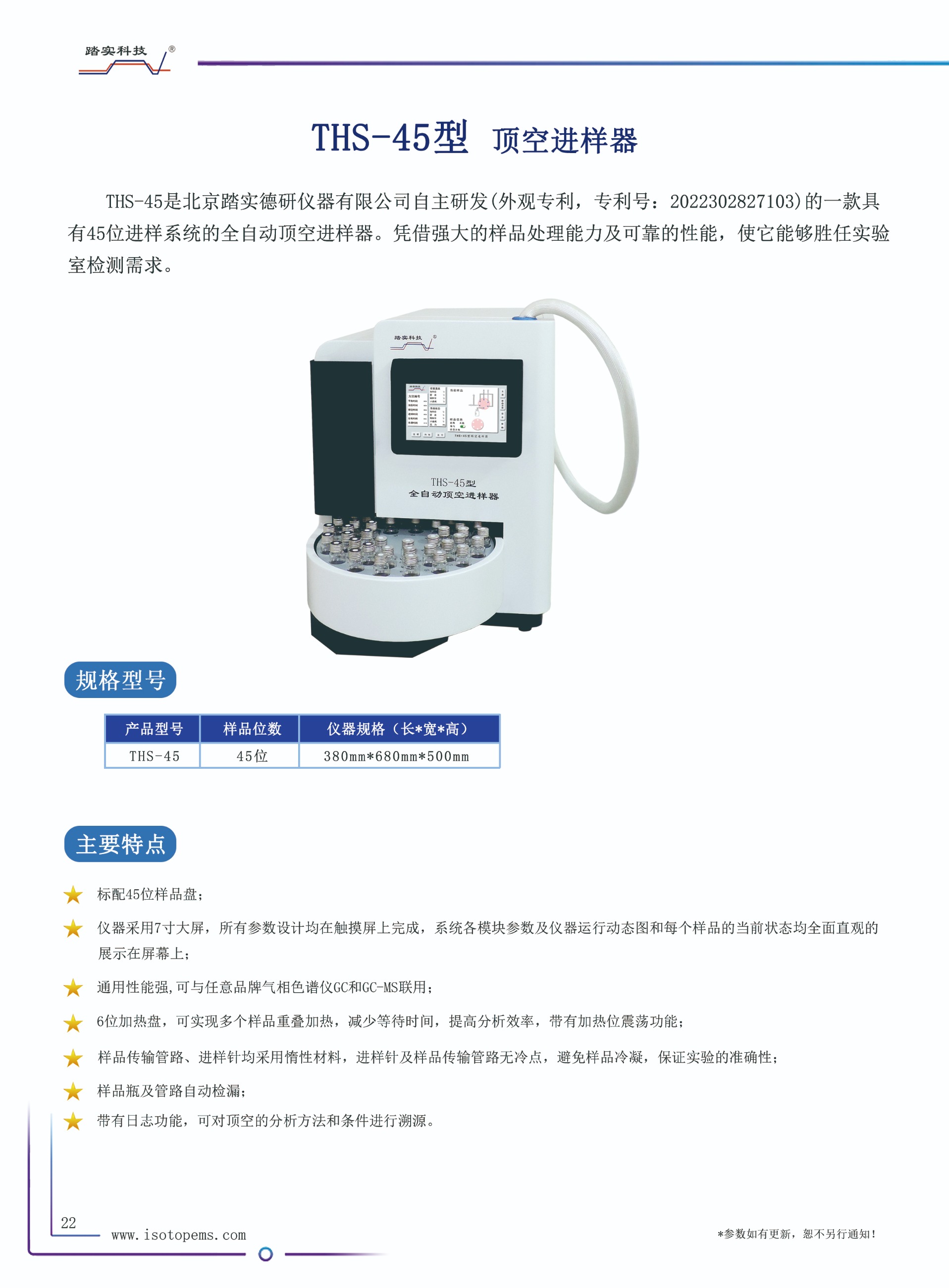THS-45型頂空進樣器是一款具有45位進樣系統(tǒng)的全自動頂空進樣器。廣泛應(yīng)用于醫(yī)療衛(wèi)生,環(huán)保,石油化工,食品行業(yè),制藥等領(lǐng)域。該儀器符合《HJ 736-2015土壤和沉積物揮發(fā)性鹵代烴的測定 頂空氣相色譜-質(zhì)譜法》、《HJ 741-2015 土壤和沉積物  揮發(fā)性有機物的測定 頂空/氣相色譜法》、《GA/T 842-2019  血液酒精含量的檢驗方法》、《HJ 1067-2019水質(zhì) 苯系物的測定 頂空/氣相色譜法》、《HJ 810-2016水質(zhì)揮發(fā)性有機物的測定 頂空氣相色譜-質(zhì)譜法》等標(biāo)準(zhǔn)。